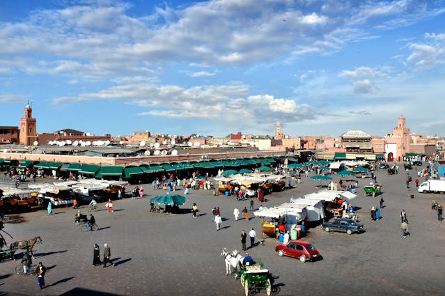 Following breakfast, embark on a comprehensive full-day guided tour of Marrakech. Your exploration will encompass the serene Menara Gardens, showcasing a beautiful pool encircled by blooming flowers, the iconic Koutoubia Minaret, and the historic Saadian Tombs. You will also visit the Dar Si Said Museum, renowned for its exceptional display of Berber arts and crafts, and the opulent Bahia Palace. Lunch will be served at a local restaurant, after which you will stroll through the vibrant and colorful souks of Marrakech. The day will conclude with a memorable sunset drink overlooking the lively Djemaa el-Fna square. Dinner and overnight accommodation will be at your Riad.