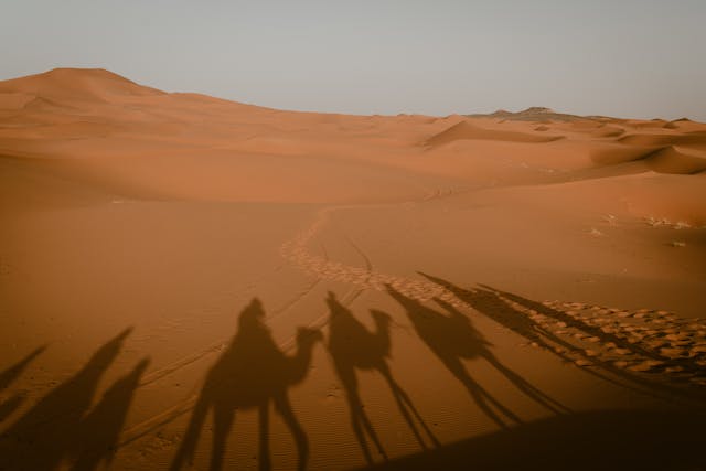 After a leisurely morning to shower and relax, we will embark on an exhilarating 4x4 excursion into the heart of the desert. This approximately 3.5-hour tour will showcase the diverse landscapes of the Erg Chebbi dunes, including dramatic black volcanic rock formations. We will visit small Berber villages and have the unique opportunity to share lunch with a local Berber family in their traditional tent, experiencing their warm hospitality firsthand. Our journey will also follow sections of the former Paris-Dakar Rally route. We will visit a fascinating site where you can witness the process of extracting fossils from the earth. In the late afternoon, prepare for an unforgettable experience: a camel trek into the mesmerizing Erg Chebbi dunes. As the sun begins to set, painting the sand with vibrant hues, we will reach our traditional Berber desert camp nestled amidst the towering dunes. Enjoy a delicious dinner under a starlit sky, accompanied by the enchanting rhythms and songs of Berber and Touareg musicians. Overnight in a comfortable Berber tent.